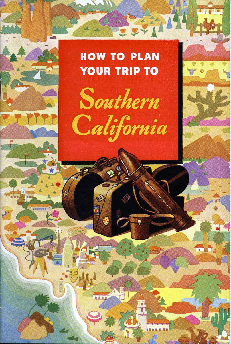 "For more fun, use this free bureau. At this unique, communinty-sponsored hospitality center, you can get free guide books, specially prepared sightseeing maps, luggage stickers, together with complete, essential Southern California vacation information."