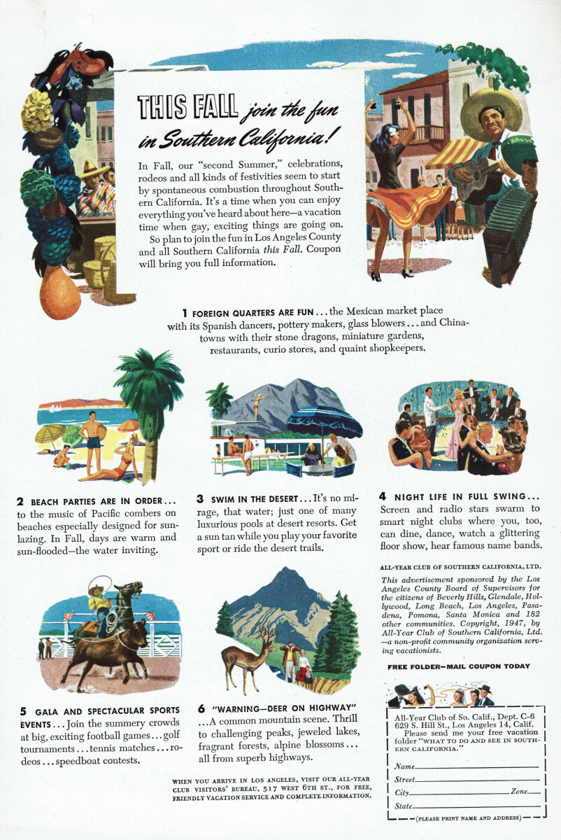 "In Fall, our 'second Summer', celebrations, rodeos and all kinds of festivities seem to start by spontaneous combustion throughout Southern California. It's a time when you can enjoy everything you've heard about here--a vacation time when gay, exciting things are going on."