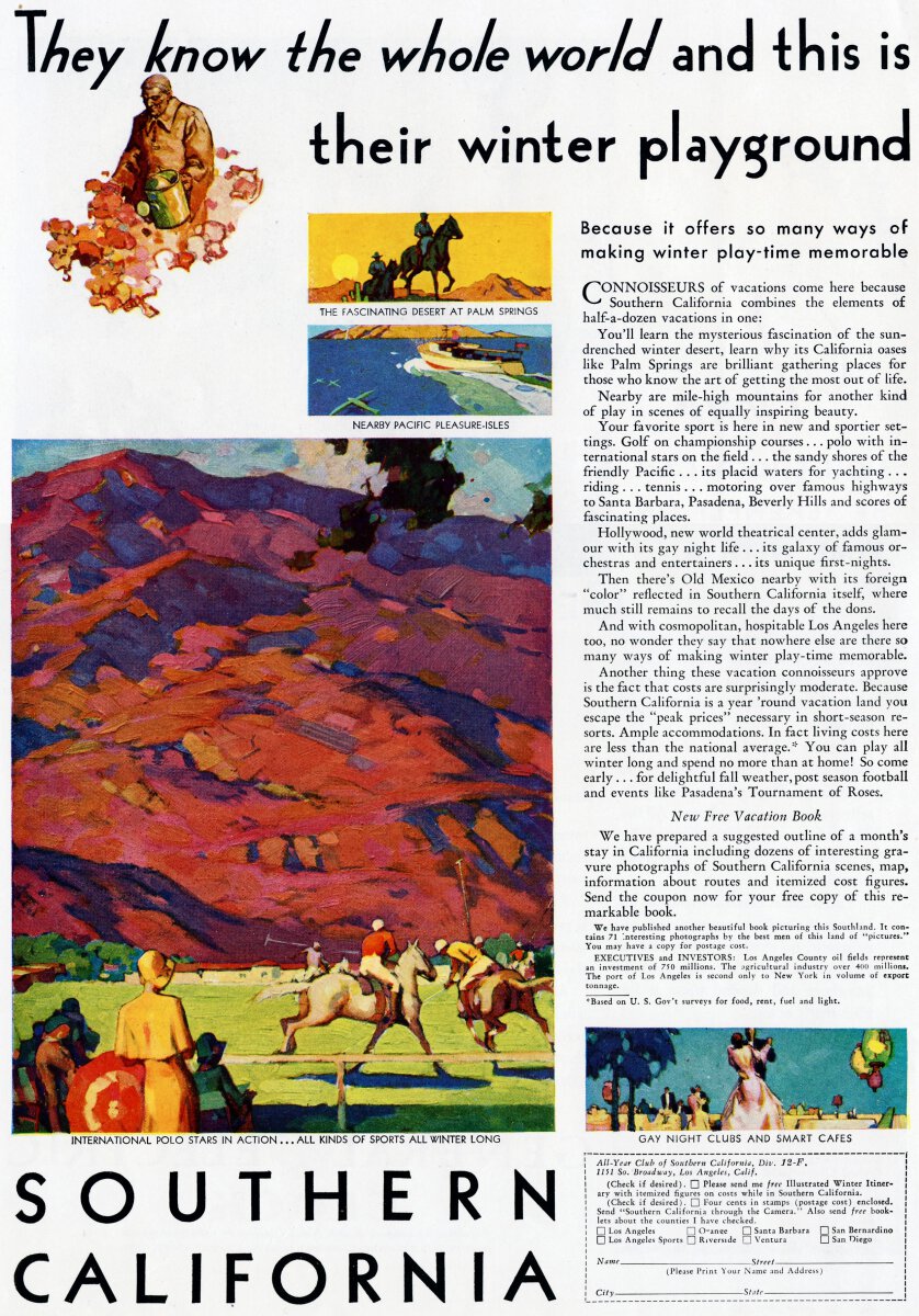 "They know the whole world and this is their winter playground. Because it offers so many ways of making winter play-time memorable. Connoisseurs of vacations come here because Southern California combines the elements of half-a-dozen vacations in one. You'll learn the mysteroious fascination of the sun-drenches winter dester, learn why its California oases like Palm Springs are brilliant gathering places for those who know the art of getting the most out of life. "